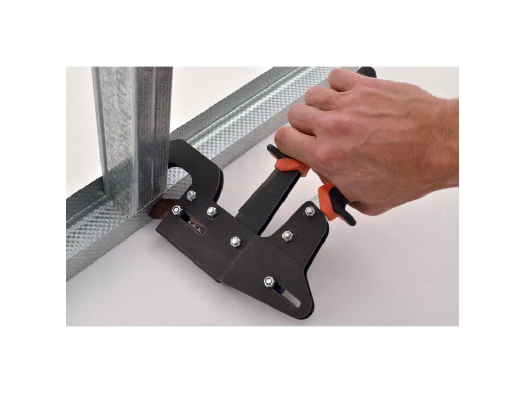 Spojování sadrokartónár profilů pomocou drobných samovrtných skrutku (tzv. blech) je zdĺhavé a přináší jeden velký problém – hlavičky vrutů vyčnívají, což zabraňuje dokonalému přilehnutí sadrokartónový dosky k roštu. Jednoruční spojovacie kliešte EDMA ULTRA PROFIL tento problém definitívne řeší. kliešte prorazí a zahnou plech obou profilů do sebe, čímž vytvoří extrémně pevný spoj, ktorý je zcela plochý a nepřekáží pri montáži dosiek.