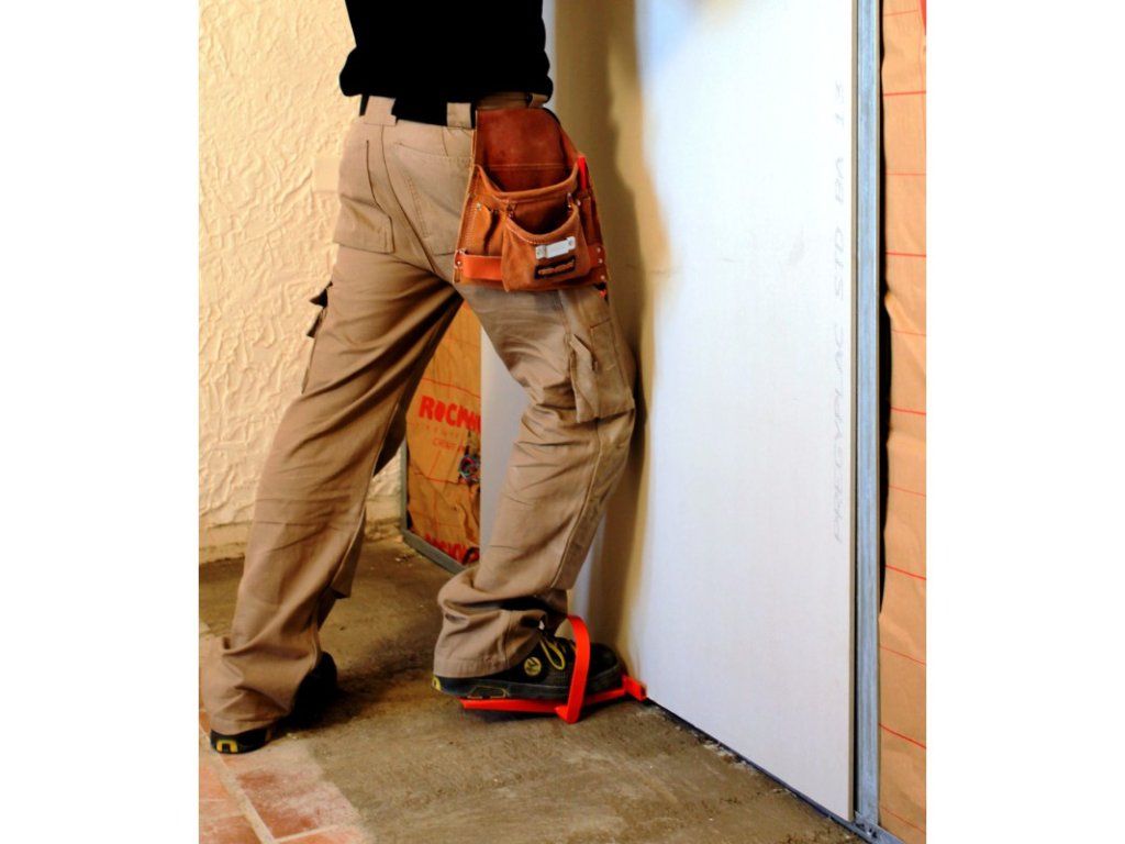 Usazování sadrokartónový dosiek na stenu vyžaduje přesné slícování s profilem a udržení dosky V správné výšce, než ji přichytíte vrutem. S kompaktním zvedacím pedálom EDMA FOOTPLAC to zvládnete sami. Jednoduše ju zasunete pod hranu dosky, vložíte špičku boty do oceľového třmenu a vahou nohy dosku ľahko přizvednete. Obě ruky vám tak zůstanou naprosto Voľné pro manipulaci s aku skrutku.